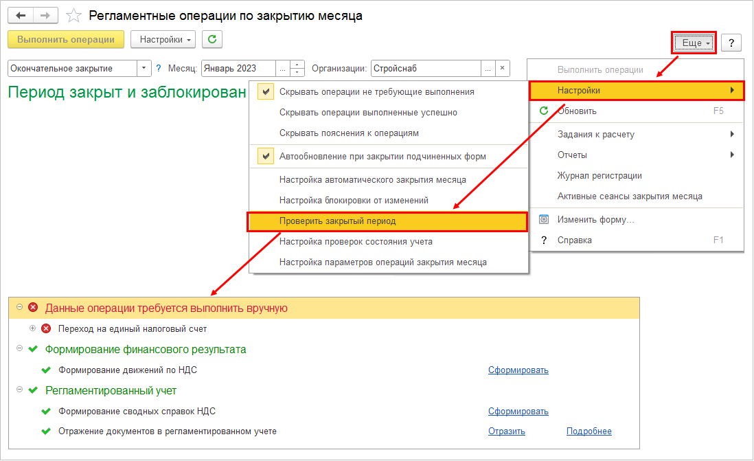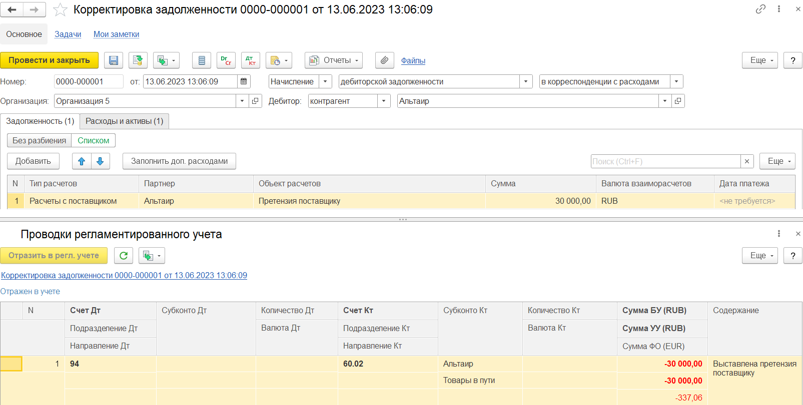 Если в акте выбран вариант отражения Списать за счет поставщика, то дополнительно по данным акта создается документ Претензия поставщику (как объект расчетов) и документ Корректировка задолженности в рамках объекта расчетов Претензия поставщику (сторно расходов за счет о бразования дебиторской задолженности по «Претензии поставщику»).