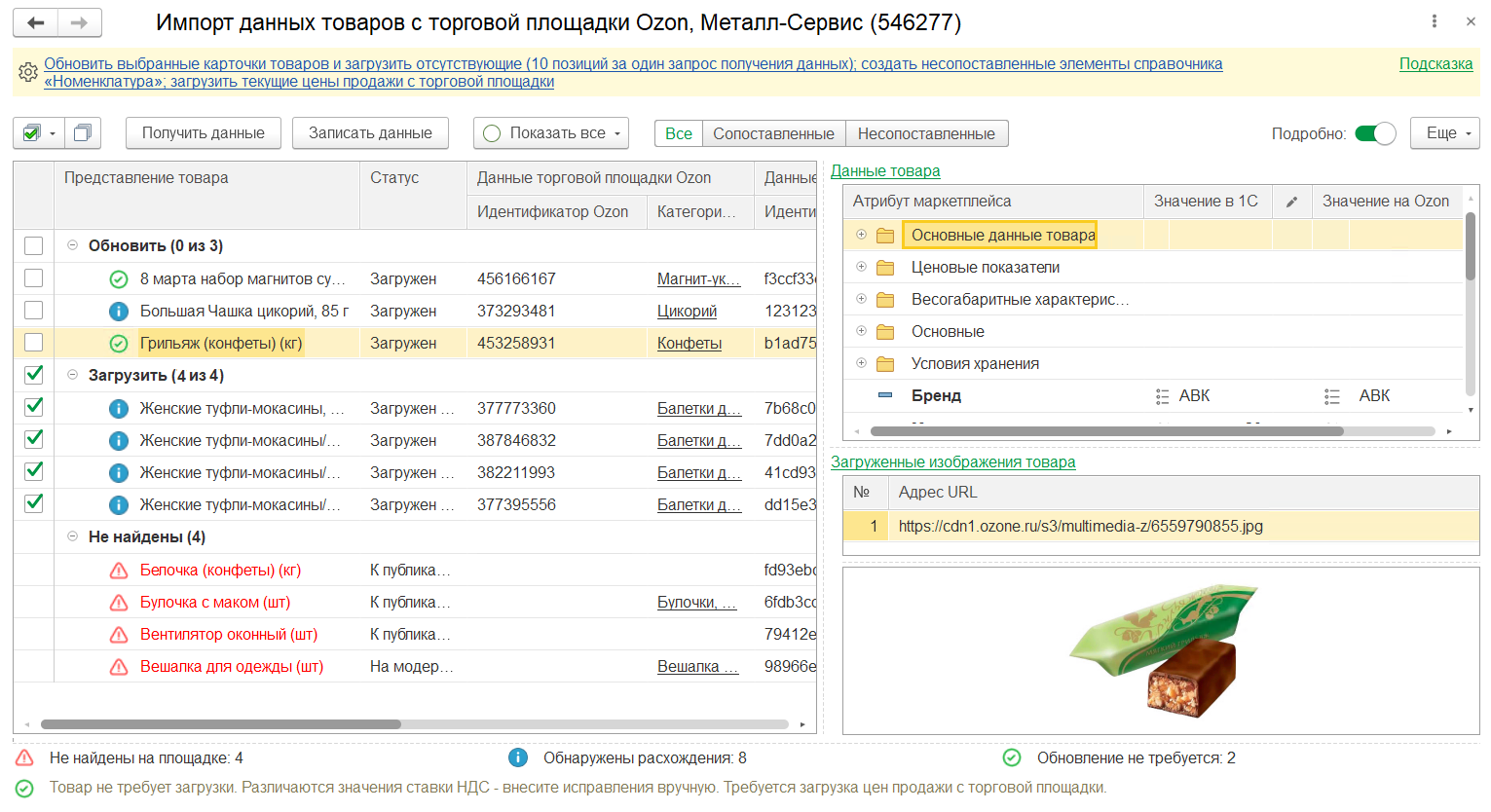 В форме Импорт данных товаров с торговой площадки Ozon при включении переключателя Подробно отображается информация о товаре на торговой площадке, в виде списка с группировкой, в том числе: основные данные карточки товара и атрибуты, весогабаритные характеристики. Также отображаются публичные ссылки загружаемых с торговой площадки изображений и выводится визуальное представление изображения.