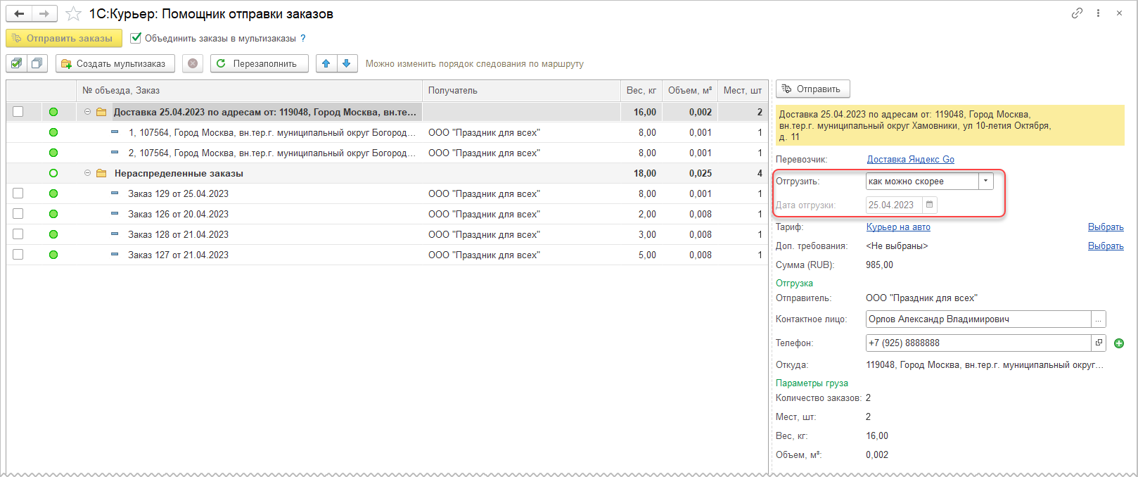 Перевозчики позволяют объединять несколько заказов на доставку с одним адресом отгрузки в одну заявку. Все заказы, входящие в мультизаказ должны быть переданы в доставку одновременно. Перед созданием мультизаказа, необходимо предварительно создать все заказы, которые планируется включить в мультизаказ, в статусе Черновик. Из формы списка заказов по кнопке Отправить открывается форма 1С:Курьер: Помощник отправки заказов. Тариф на отправку мультизаказа будет зависеть от варианта отгрузки, который выбирается в правой части формы (реквизите Отгрузить ) и может принимать значения: