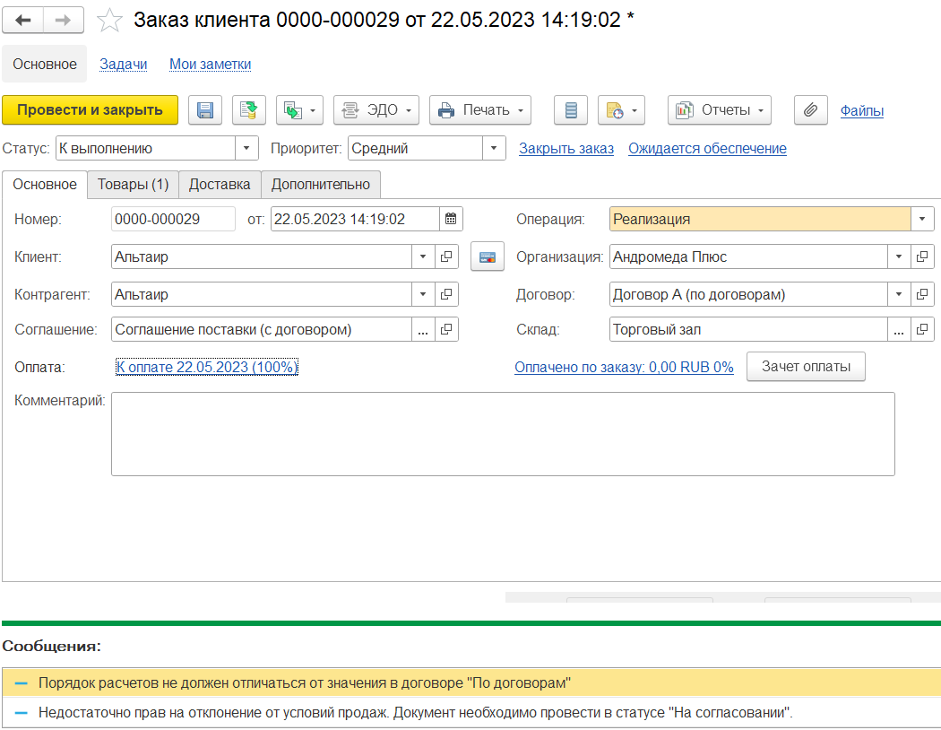 После успешного согласования статус заказа автоматически устанавливается в значение К выполнению.