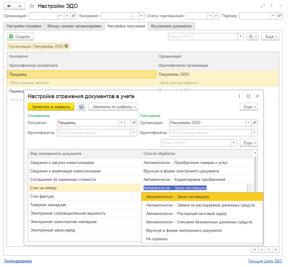 Покупателю в своей информационной базе необходимо настроить ЭДО с продавцом. Для этого предварительно должно быть отправлено и принято Приглашение к обмену электронными документами. Также требуется настроить способ обработки входящих документов. Настройки выполняются в форме Администрирование - Обмен электронными документами - Настройки ЭДО на закладке Настройки получения. Настройки задаются отдельно по каждому контрагенту а форме Настройка отражения документов в учете. В этой форме для каждого вида электронного документа выбирается способ обработки: Автоматически с указанием вида автоматически создаваемого документа информационной базы, Вручную в форме электронного документа или Не отражать.