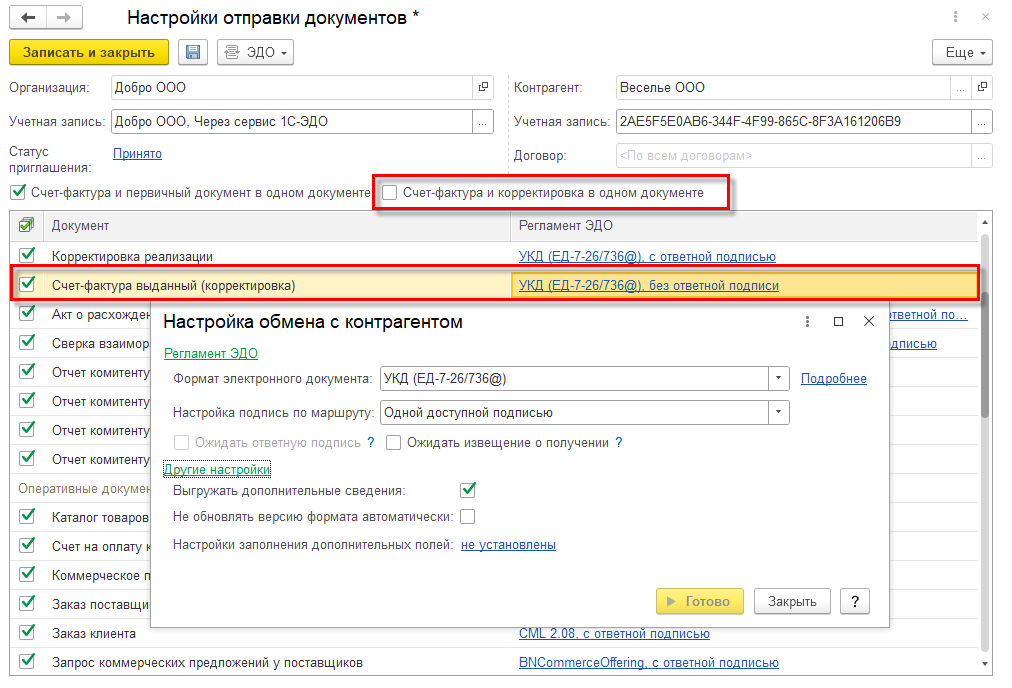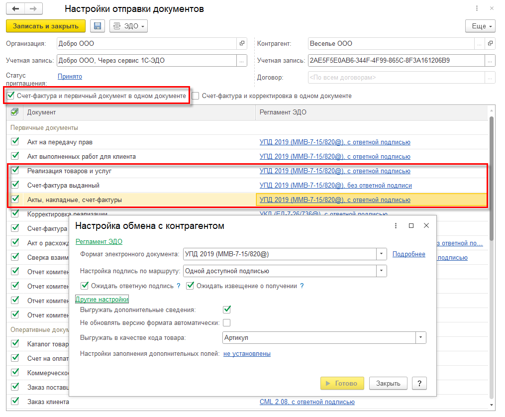 Для возможности отправки электронного УПД со статусом 1, который совмещает счет-фактуру и накладную в форме Настройки отправки документов необходимо установить флаг Счет-фактура и первичный документ в одном документе. В случае реализации по договору купли-продажи флаг рекомендуется установить, а в случае передачи на комиссию – не устанавливать.