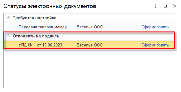 Так как наряду с возможностью обмена электронными документами через оператора ЭДО, предусмотрена возможность прямой передачи документов между организациями в нерегламентированном формате без участия оператора ЭДО, в момент формирования документа нужно уточнить требуемый вариант. Для этого в форме Статусы электронных документов в строке «УПД №…» нужно перейти по гиперссылке Сформировать.
