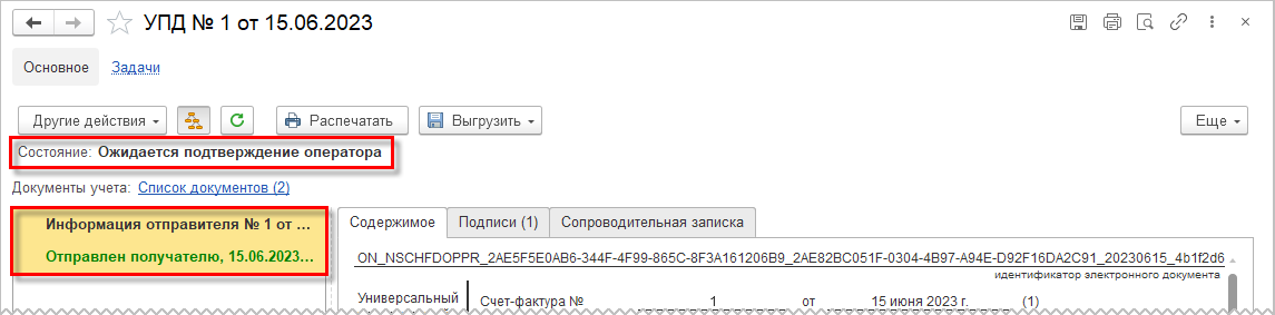 До момента получения от оператора Подтверждение даты отправки по информации покупателя этот УПД будет отображаться в списке Текущие дела ЭДО в папке Входящие \ На контроле. После получения подтверждения электронный документооборот у покупателя будет завершен. Документ перемещается в папку Ознакомится, из которой можно открыть форму просмотра электронного документа.