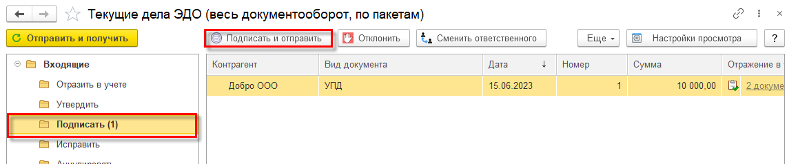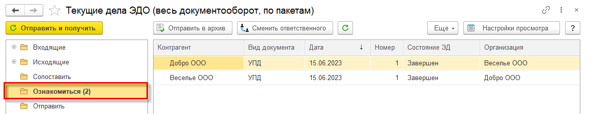 На стороне организации-продавца документ будет загружен при очередном информационном обмен с оператором ЭДО по настроенному расписанию (для клиент-серверного варианта) или при выполнении команды Отправить и получить из списка Главное – ЭДО - Текущие дела ЭДО.
