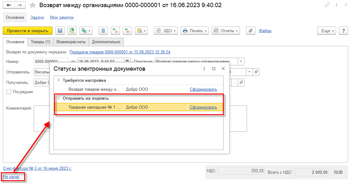 Так как для документа Возврат между организациями наряду с возможностью обмена электронными документами через оператора ЭДО, предусмотрена возможность прямой передачи документов между организациями в нерегламентированном формате без участия оператора ЭДО, в момент формирования документа нужно уточнить требуемый вариант. Для этого в форме Статусы электронных документов в строке «Товарная накладная №…» нужно перейти по гиперссылке Сформировать.