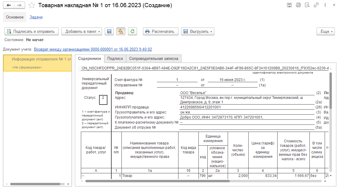 Для начала обмена ЭДО по операциям между собственными организациями через оператора ЭДО нужно сформировать, подписать и отправить электронный документ со стороны организации-продавца. Это можно сделать: