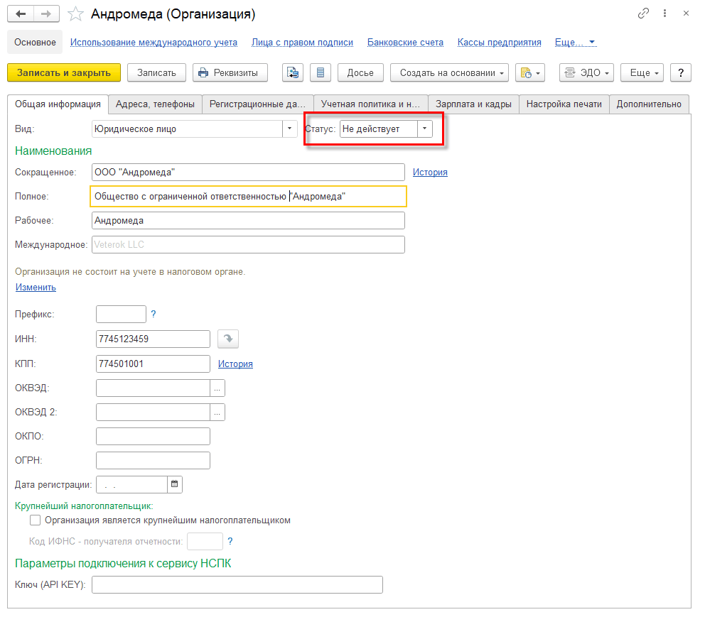 Для карточки организации предусмотрен реквизит Статус, который принимает значение Действует или Не действует. С момента создания организации и в течение всего периода отражения операций по организации используется статус Действует. После завершения отражения операций устанавливается статус Не действует.