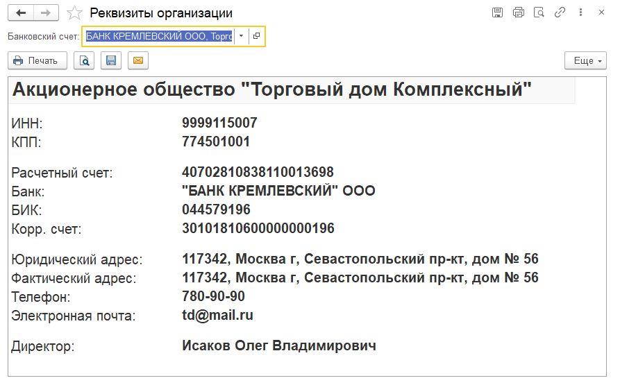 В карточке организации предусмотрена печатная форма Реквизитов организации (команда Реквизиты). В настройках формы можно выбрать банковский счет, который будет включен в состав печатной формы.
