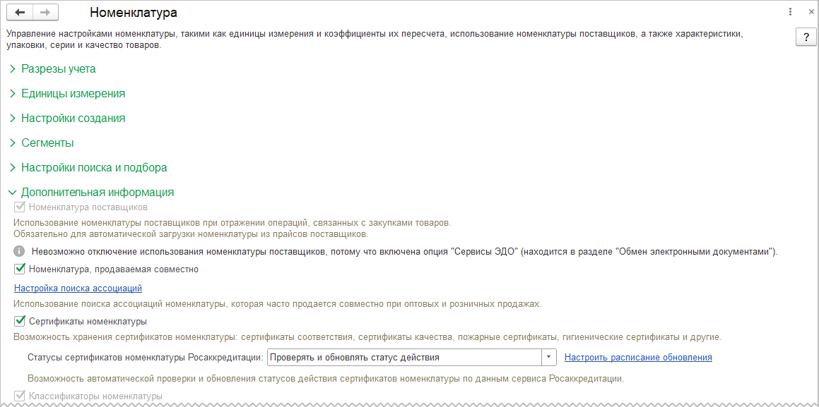 Федеральная служба по аккредитации (ФСА) разработала сервис для проверки актуальности сведений о сертификатах соответствия и декларациях соответствия https://pub.fsa.gov.ru/rss/certificate. В рамках интеграции с сервисом предусмотрено получение статус актуальности сертификатов и деклараций соответствия, сведения о которых внесены в информационную базу. Сведения о сертификатах и декларациях соответствия в информационную базу вносятся при установленной функциональной опции НСИ и администрирование – Настройка НСИ и разделов – Номенклатура – Дополнительная информация – Сертификаты номенклатуры.
