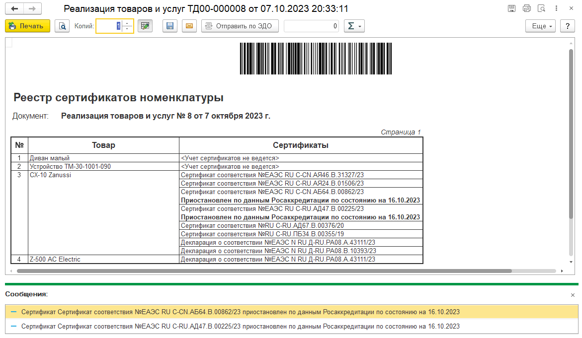 В печатных формах Реестра сертификатов номенклатуры выводится дополнительная информация, если Статус Росаккредитации недействителен.