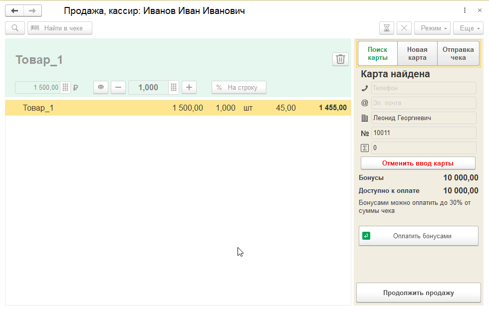 Во внешнем РМК для начисления бонусных баллов и применения скидок по бонусами необходимо считать карту лояльности клиента или выполнить поиск карты по номеру карты, номеру телефона или e-mail. Поиск карты выполняется «на лету», загрузки карт в систему-получатель не требуется. Поиск выполняется среди действующих карт. В результате поиска может вернуться несколько карт, тогда кассиру будет предоставлена возможность выбора нужной из списка