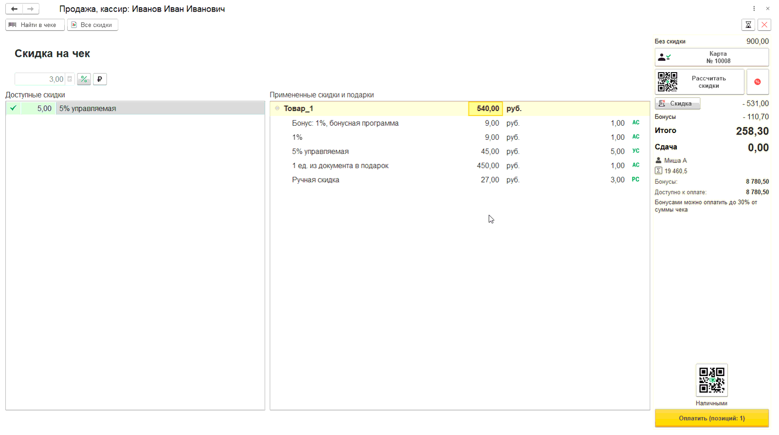 Скидки применяются во внешнем РМК по кнопке Рассчитать скидку. При этом отображается примененные скидки, включая сумму начисленных баллов по карте.