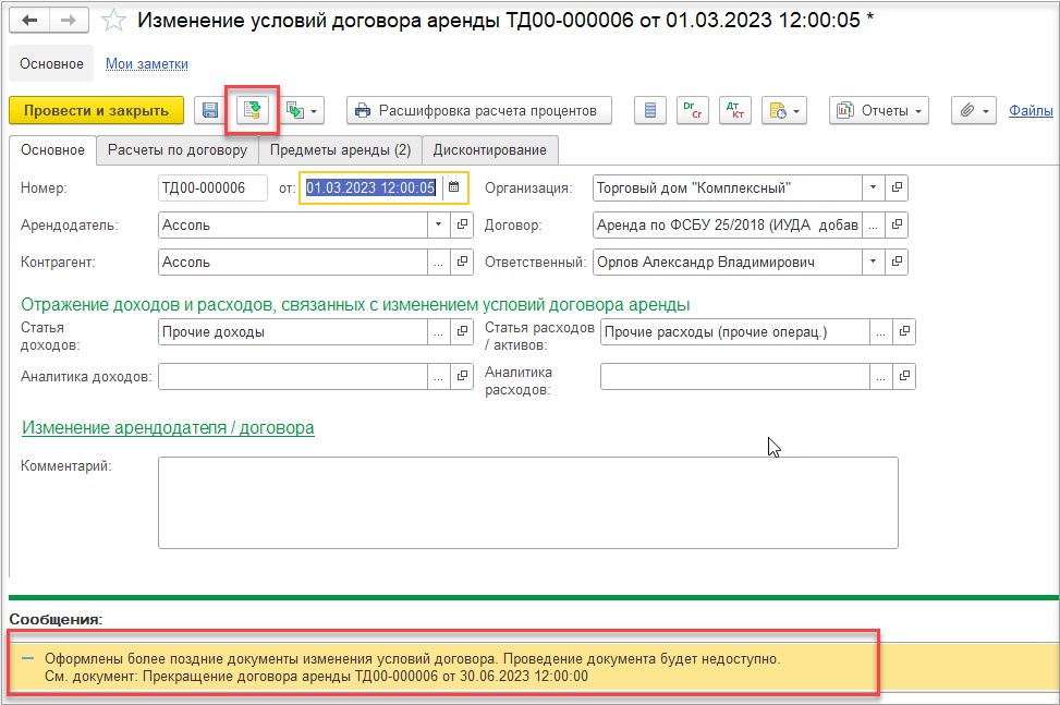 Доработан документ Изменение условий договора аренды.