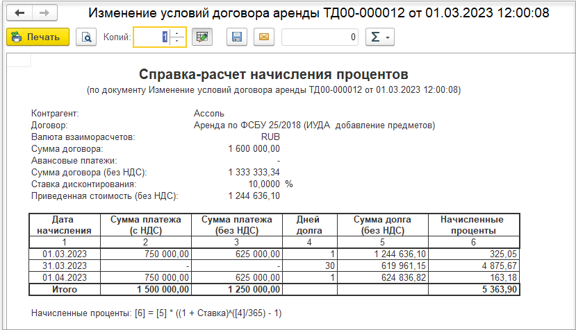 В полях Сумма услуг по аренде и Сумма НДС по аренде автоматически выводятся данные по будущим платежам и начислениям на основании графиков оплат и начислений, начиная с даты документа Изменение условий договора аренды. В поле Обеспечительный платеж выводятся данные о не зачтенном остатке по обеспечительному платежу.