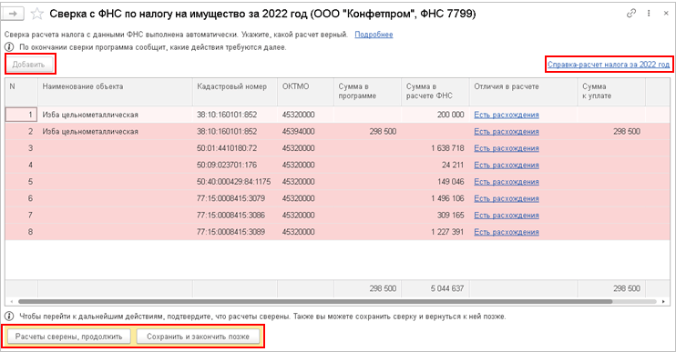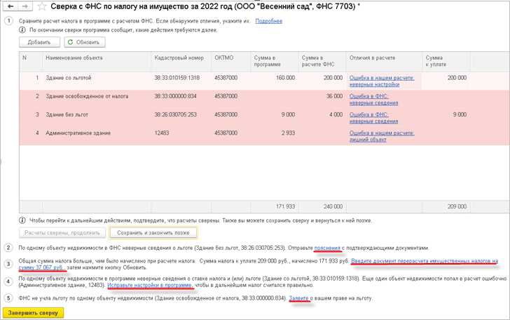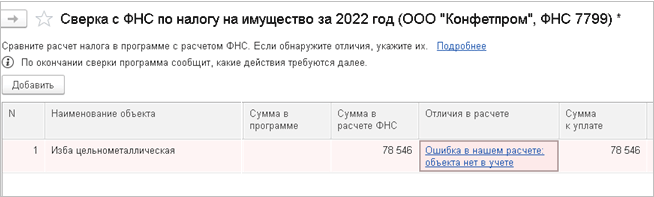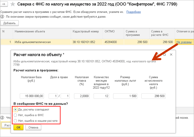 Если сверка расчета налога с данными ФНС выполнена автоматически, при наличии расхождений в строке также можно открыть карточку расчета налога по объекту и выбрать вариант указания отличий.