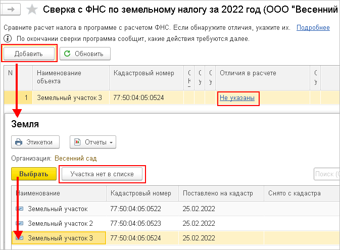 Кнопки Участка нет в списке в случае сверки по земельному налогу, Недвижимости нет в списке в случае сверки по налогу на имущество и ТС нет в списке в случае сверки по транспортному налогу добавляют строку в документ, даже если ОС нет в справочнике. Наименование ОС вводится вручную в строке документа после добавления.