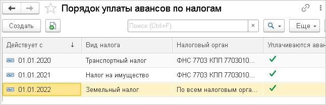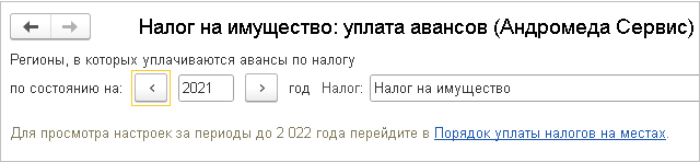 Переносятся записи по настройке уплаты авансов по транспортному налогу с 01.01.2021 г. и налогу на имущество с 01.01.2022 г.