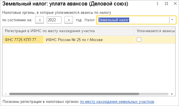 В форме настройки уплаты авансов по земельному налогу параметры остались прежними.