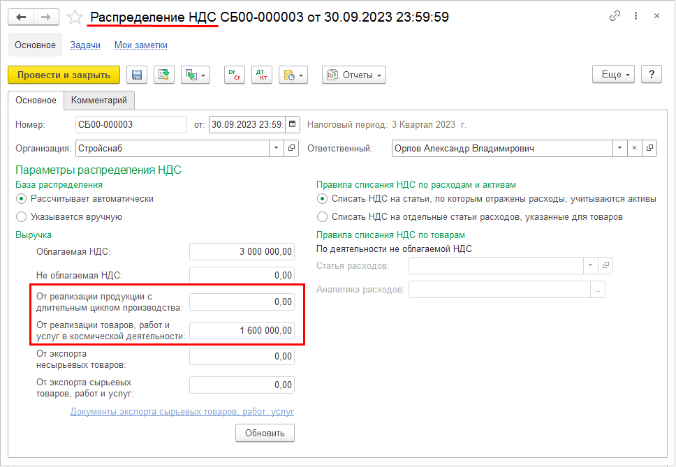 В документ Распределение НДС добавлены сведения о выручке, относящейся к космической деятельности (если в учетной политике организации включена настройка Учет НДС в космической деятельности) и к реализации продукции с длительным циклом производства (если в учетной политике организации включена настройка Учет НДС длительного цикла производства).