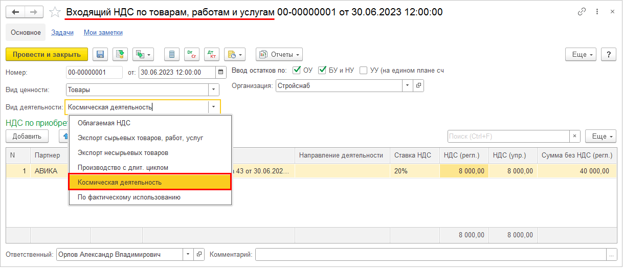 Для ввода остатков товарно-материальных ценностей и входящего НДС, относящихся к космической деятельности, в документы ввода остатков материальных ресурсов и документы Ввод остатков НДС по приобретенным ценностям добавлен выбор вида деятельности НДС Космическая деятельность.