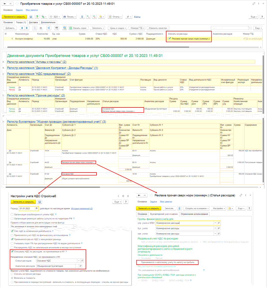 Если у организации включена настройка Списывать НДС по расходам, не принимаемым в НУ, тогда при отражении операций приобретения товаров и услуг со списанием на расходы, не признаваемые в НУ (в карточке элемента списка Статьи расходов выключен признак Принимаются к налоговому учету по налогу на прибыль), а также при списании товарно-материальных ценностей (далее - ТМЦ) на такие расходы, соответствующий им НДС будет списан на расходы с использованием статьи и аналитики из настройки Направление списания НДС, не принимаемого к НУ в блоке Настройки учета НДС учетной политики. При этом не учитываются настройка Раздельный учет НДС по расходам в статье расходов, на которую списываются товары (услуги) и вид деятельности НДС, указанный в документе.
