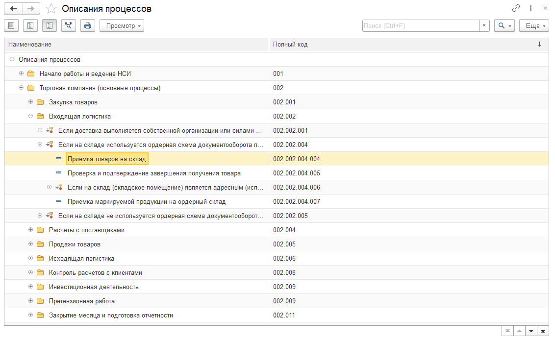 На верхнем уровне иерархии в отдельный процесс (группу справочника верхнего уровня) выделены основные настройки и заполнения НСИ. Далее следует описание основных процессов предприятия, к которым условно отнесены закупки у поставщика, оптовые продажи, входящая и исходящая логистика, взаиморасчеты с поставщиками и покупателями. Как правило, эти процессы есть на любом предприятии. Далее идет описание дополнительных процессов по сферам деятельности предприятия, которые могут быть представлены на отдельных предприятиях в зависимости от специфики их деятельности (например, комиссионная торговля) и/или возникают в деятельности отдельных предприятий эпизодически.