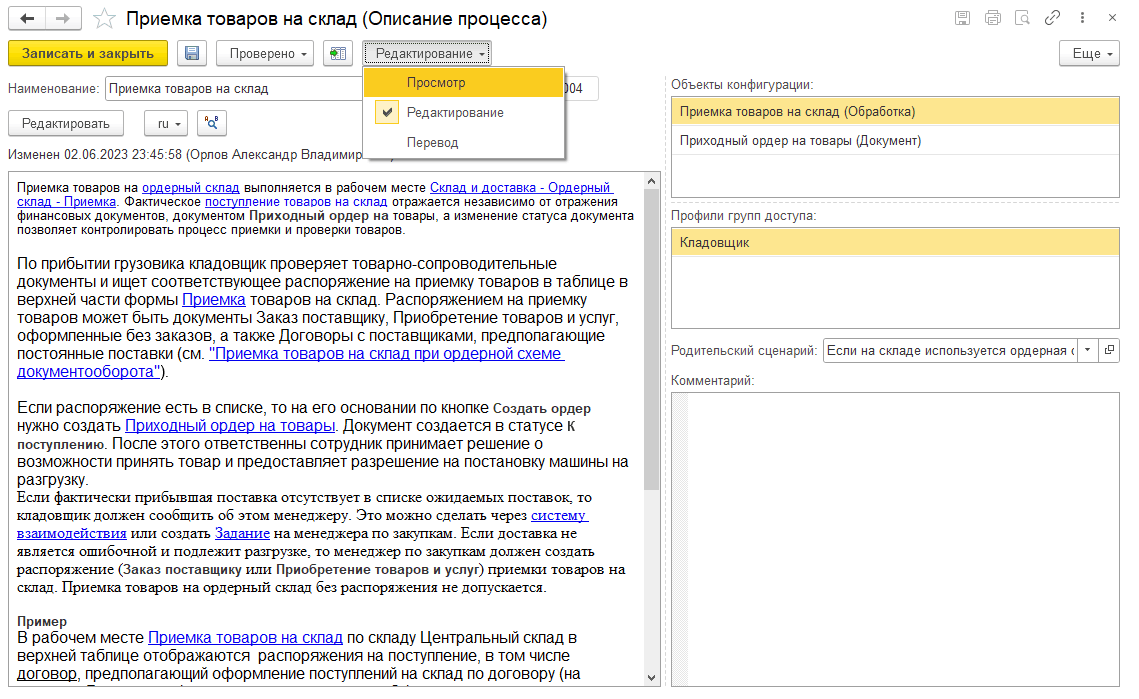 В форме элемента (шага процесса) в режиме редактирования в правой части отображаются таблицы объектов конфигурации и профилей групп доступа, соответствующих исполнителям. Также в панели в правой части отображается комментарий.