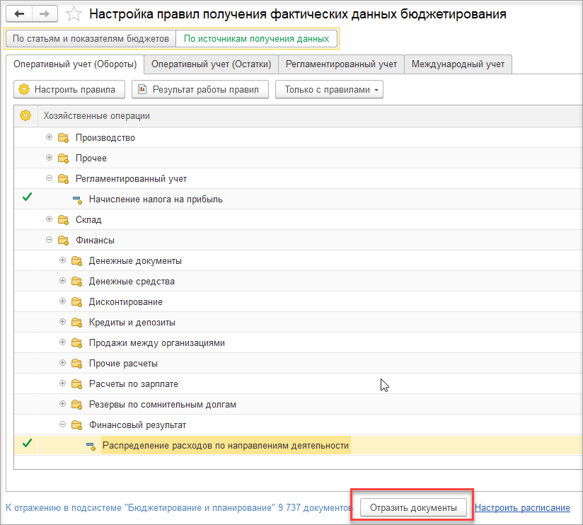 После того как по всем правилам получения фактических данных будет установлен флаг Хранить результат выполнения правила их необходимо отразить в бюджетировании, нажав на кнопку Отразить документы.