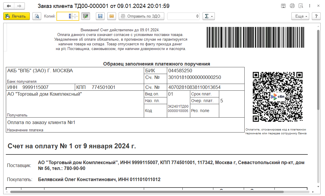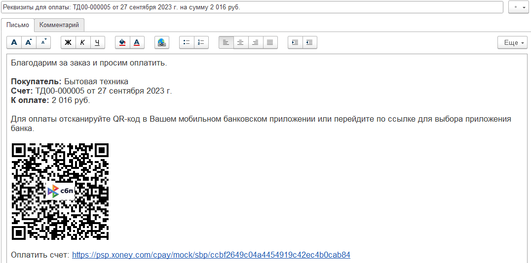 Если была сформирована платежная ссылка, QR-код оплаты по СБП выводится в форму счета на оплату.