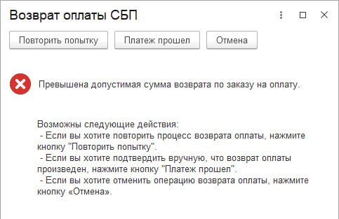 По факту оплаты регламентным заданием Загрузка статусов операций СБП будет автоматически зарегистрирован документ Эквайринговая операция с операцией Поступление оплаты от клиента. В документ «Эквайринговая операция» будет записано значение идентификатора оплаты СБП для возможности проведения возврата оплаты.