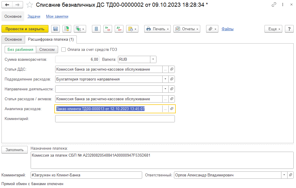 ■ В отдельном списании со счета - банк зачисляет оплаты от покупателей в полном объеме. Комиссия отражается отдельным документом Списание с расчетного счета с видом операции Прочий расход.