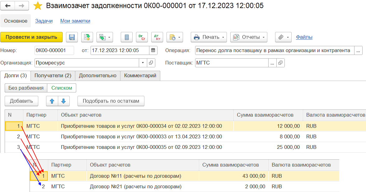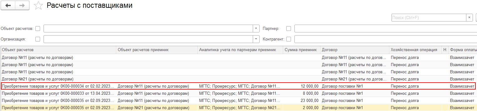 Например, в движениях оперативных регистров расчетов взаимозачета задолженности источник задолженности «Договор между организациями №2» распределяется на получателя (приемник) задолженности – объект расчетов, документ «Передача товаров между организациями» от 12.04.2023. Для источника задолженности «Договор между организациями №2» заполняются реквизиты «Объект расчетов приемник», «Аналитика учета по партнерам приемник», «Сумма приемник», «Валюта приемник».