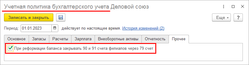 В блок Учетная политика бухгалтерского учета учетной политики организации добавлена настройка При реформации баланса закрывать 90 и 91 счета филиалов через 79 счет.