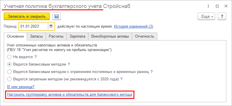 Для организаций, применяющих балансовый метод учета по ПБУ 18/02 «Учет расчетов по налогу на прибыль» (далее – ПБУ 18), поддержана возможность настройки пользователем группировки видов активов и обязательств для расчета отложенных налогов.