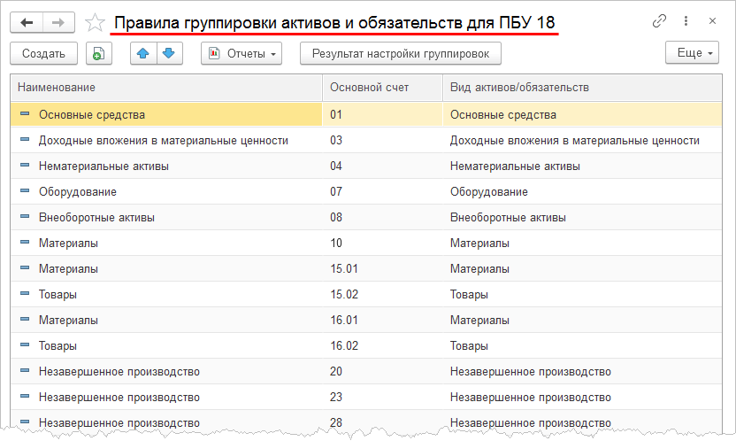 При включении функциональной опции Использовать настраиваемую группировку видов активов и обязательств для ПБУ 18 список Правила группировки активов и обязательств для ПБУ 18 заполняется автоматически. В него переносятся данные о сопоставлении счетов с видами активов и обязательств из кода системы.