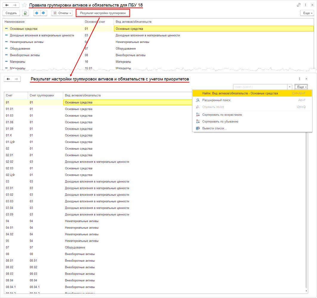 В форме Результат настройки группировок активов и обязательств с учетом приоритетов выводится информация о том, какой вид активов/обязательств сопоставлен каждому субсчету в результате настройки правил. В поле Счет группировки указывается Основной счет из правила, в котором настроено сопоставление для субсчета. В списке Результат настройки группировок активов и обязательств с учетом приоритетов поддерживается возможность установки фильтров, поиска и сортировки значений в любой графе.