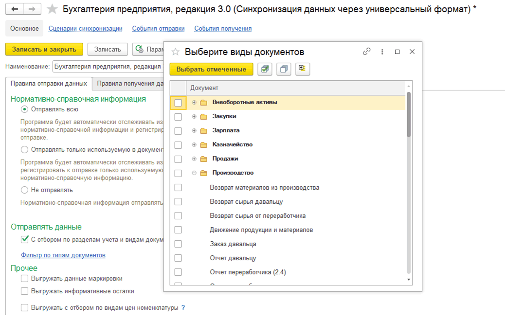Предусмотрена возможность тонко настраивать синхронизацию между источником и приемником, указывая доступные к отправке виды документов. Возможность включается отдельно для каждой настройки плана обмена (список Настройки синхронизации данных) в карточке синхронизации на закладке Правила отправки данных установкой флага С отбором по разделам учета и видам документов. Из формы синхронизации плана обмена по ссылке Фильтр по типам документов становится доступна форма выбора документов для регистрации.