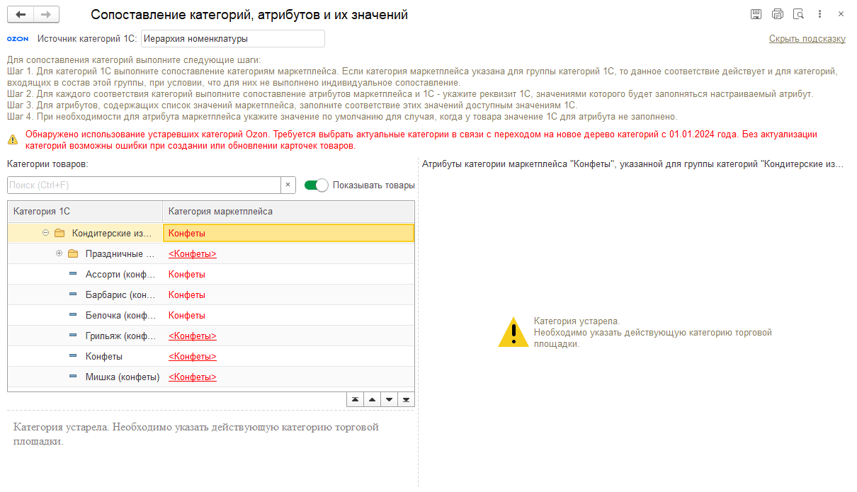 В связи с изменением дерева категорий торговой площадки требуется актуализация сопоставления категорий в 1С и торговой площадки Ozon, а также контроль ранее настроенных правил сопоставления атрибутов, т.к. состав атрибутов при изменении сопоставления (указания типа товара) также может измениться. Для упрощения контроля необходимости актуализации сопоставления категорий в форме настроек обмена с Ozon и в форме сопоставления категорий, атрибутов и их значений добавлено оповещение о наличии устаревших категорий.