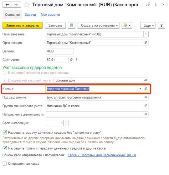 Реквизит Кассир в карточке кассы организации является необязательным для заполнения. Если реквизит заполнен, то в документы РКО и ПКО автоматически подставляется кассир, указанный в карточке кассы. Если реквизит не заполнен, то в кассовые документы по умолчанию подставляется последний выбранный кассир в этих документах по данной кассе.