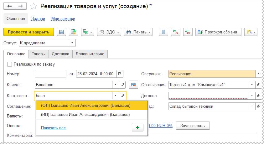 При заполнении в документах контрагента вводом с клавиатуры ФИО или ИНН в списке подбора для контрагентов с типом «Физическое лицо» и «Индивидуальный предприниматель» выводится подсказка, соответственно: "ФЛ" или "ИП".