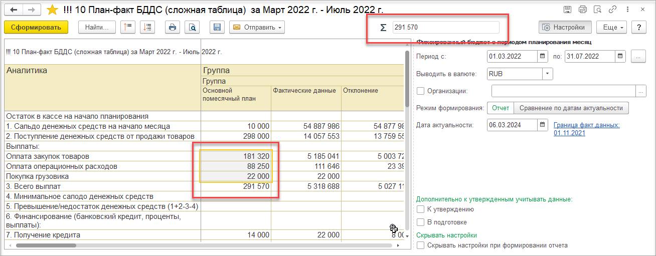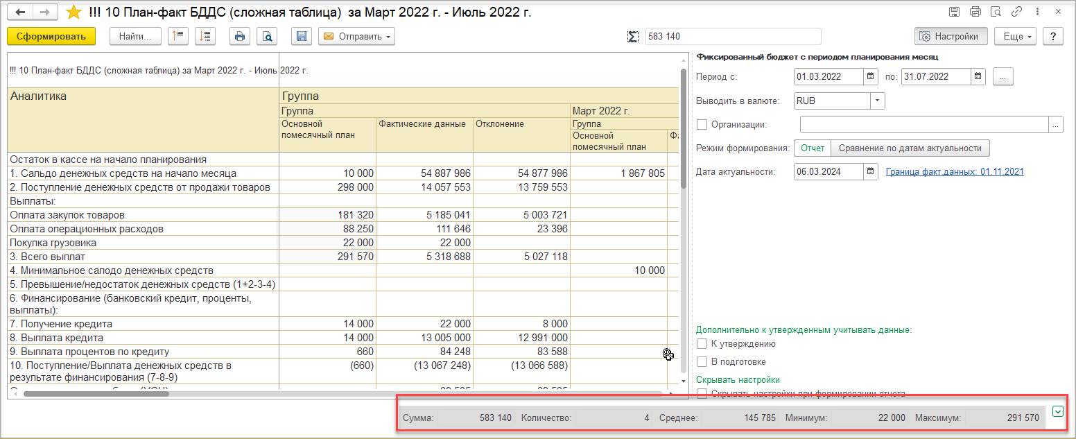 В форме бюджетного отчета и экземпляра бюджетов добавлена возможность рассчитать сумму, количество, среднее значение, а также определить максимум и минимум для выделенных ячеек.
