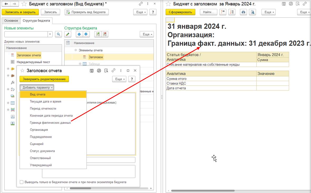 Добавлен параметр Граница фактических данных для вывода в заголовок и нередактируемый текст бюджетного отчета.