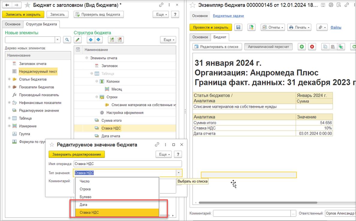 Для настройки вида бюджета добавлены новые типы редактируемого значения: