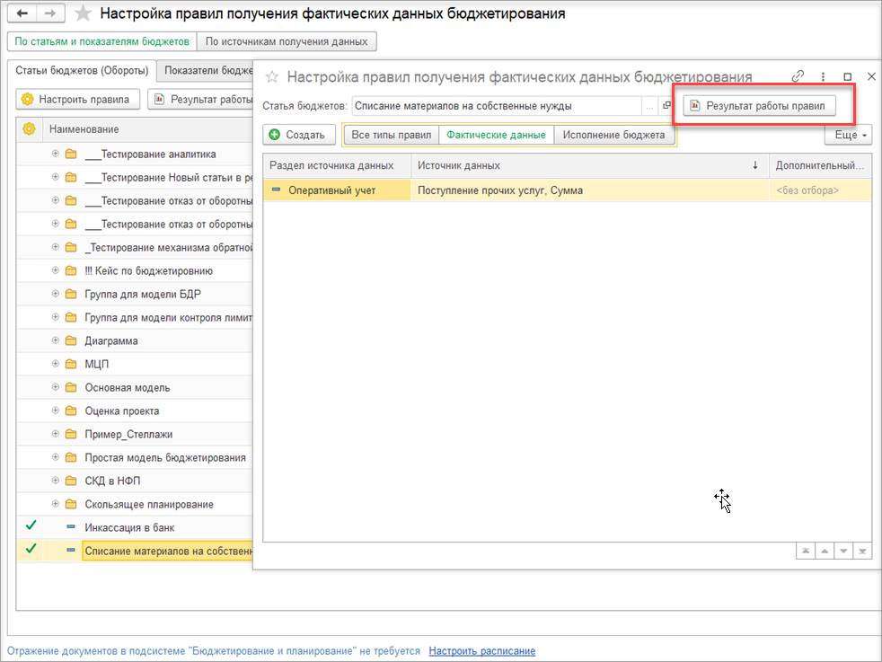 В рабочем месте Настройка правил получения фактических данных бюджетирования в настройке по конкретному правилу для статьи бюджета и показателя бюджета добавлена команда вызова отчета Результат работы правил.