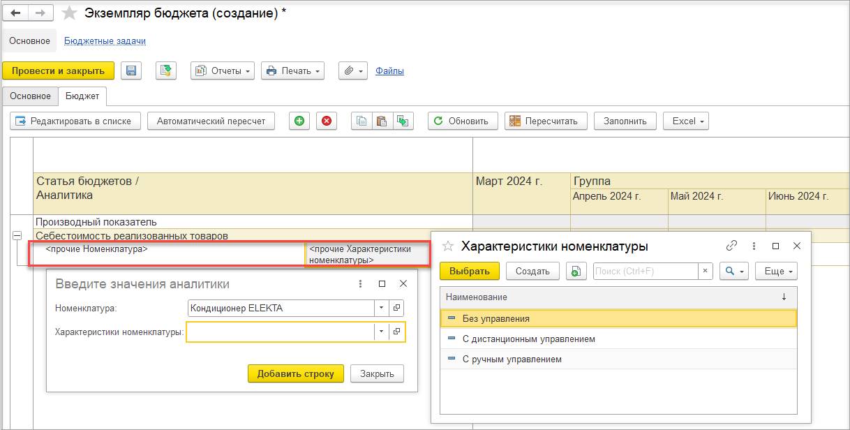Добавлена аналитика для статьи бюджета, показателя бюджета и НФП Характеристики номенклатуры. Настроена связь с аналитиками Вид номенклатуры и Номенклатура, при этом обязательно использование одной из них совместно с характеристиками номенклатуры.