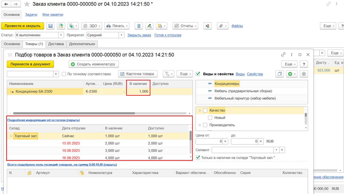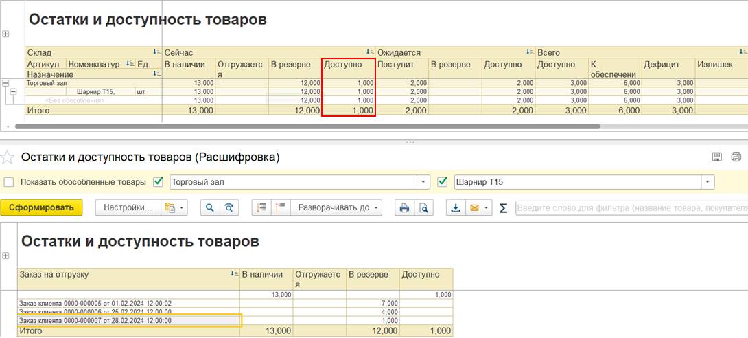 В отчетах «Доступно» означает доступность товара к отгрузке для нового заказа с самым низким приоритетом, либо по беззаказной схеме. Заказ с более высоким приоритетом вымещает ранее принятые заказы из ожидаемых поступлений. Колонка «В наличии» позволяет оценить доступность товара для заказа, при условии повышения его приоритета до максимального.