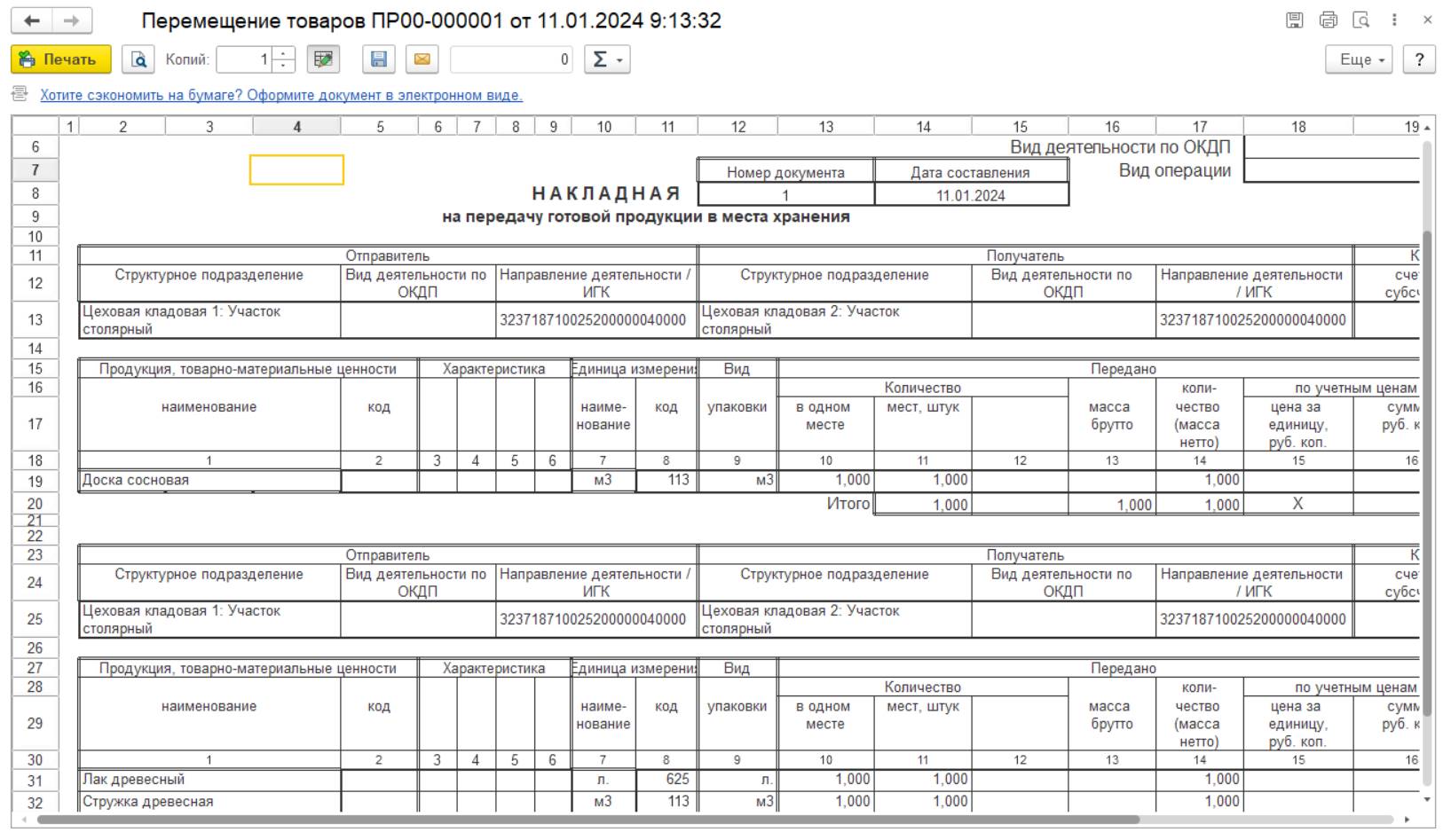 Если в одном документе для разных строк указаны разные НД/ИГК, то таблица товаров в печатных формах МХ-18 "Накладная на передачу готовой продукции в места хранения" и М-11 "Требование-накладная" разбивается на сколько отдельных таблиц, по каждому НД/ИГК отправителя и получателя.