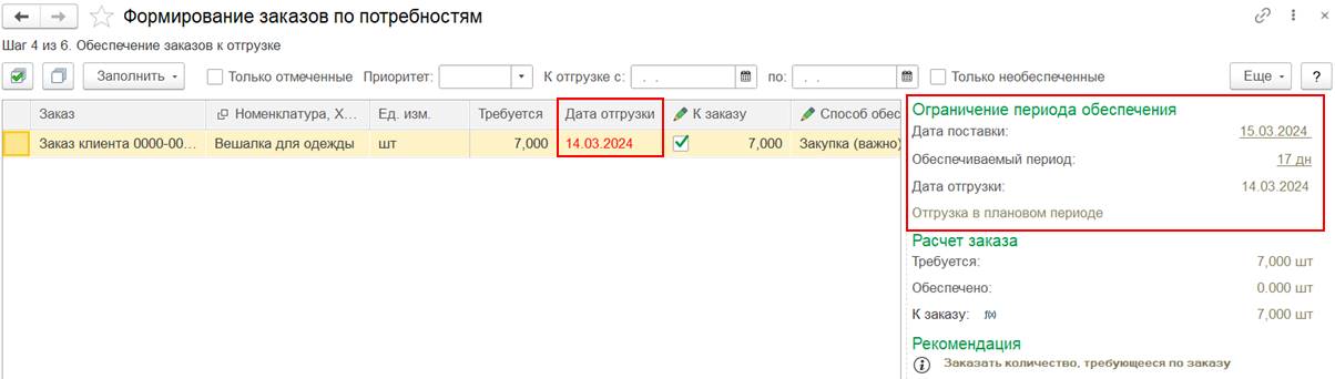 При правиле формирования заказов «Заказ при достижении точки заказа», заданном в способе обеспечения потребностей, предлагается заказать с учетом даты отгрузки заказа:
