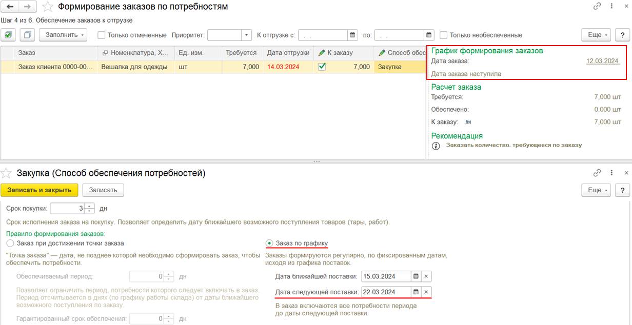 При правиле формирования заказов «Заказ по графику» учитывается дата следующей поставки. Предлагается заказать с учетом даты отгрузки заказа: